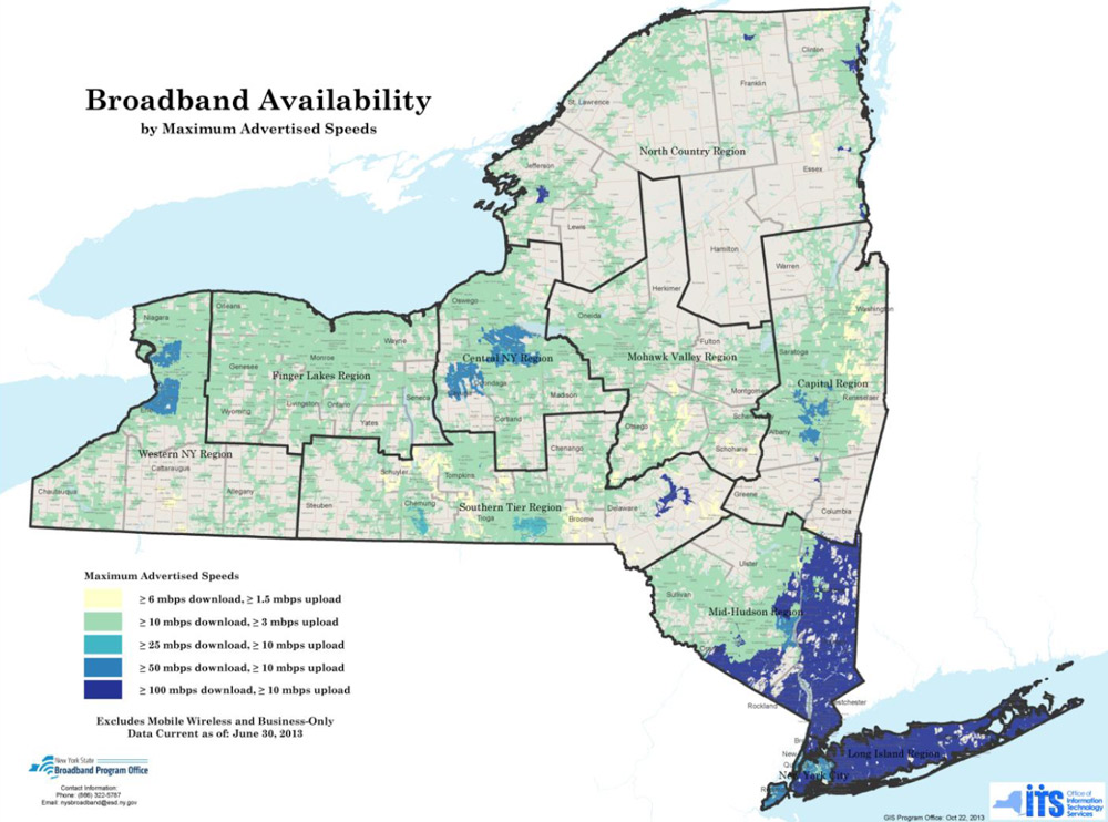 Secondly, by modeling the existing “state of play” and applying FCC and PSC data collection to New York State mapping, the Broadband initiative identified areas that lack access to adequate broadband service based on regional requirements and economic goals. The initiative was able to accurately: